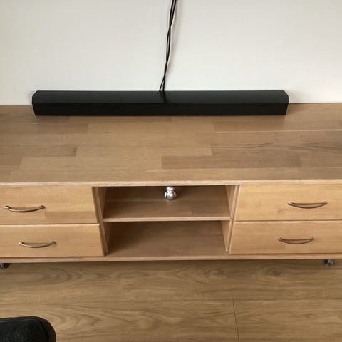 Elegant og bastant TV/HIFI-bænk med 2 hylder. Massivt sort-bejdset træ (vist nok eg) i 2 niveauer og med metal-meder.