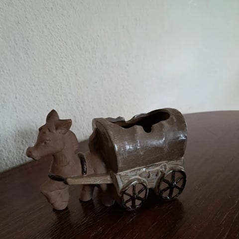 Lille vintage hestefigur i brun glaseret keramik. Figuren måler ca. 6 cm i højden og forestiller en liggende hest i en varm, rustbrun glasur med fint håndlavet udtryk. Fremstår i pæn stand med lette brugsspor. En charmerende lille dekoration, perfekt til samlere, hyldepynt eller som del af et miniaturemiljø.