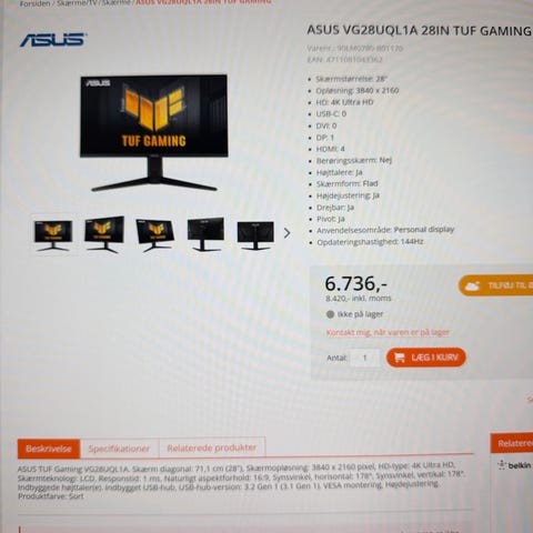 ASUS TUF VG28U 28" 4k 144hz perfect tilstand samme indpakning kun brugt et havl år. Igen døde pixels maget good back bleed.