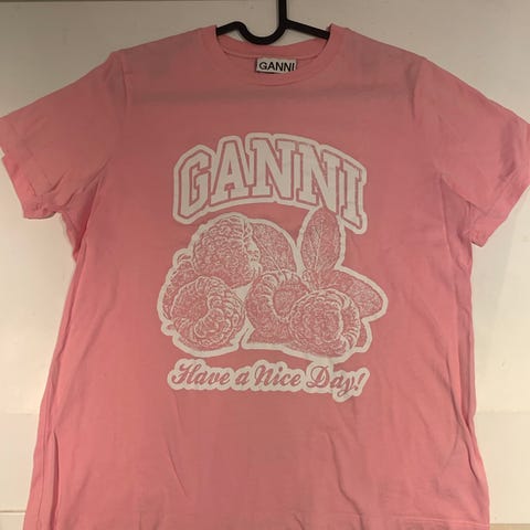 Top, Ganni, str. 40, Sort, Næsten som ny, Fed sort top/T-shirt fra Ganni med metallic print i str 40/42. Den er lavet af viscose. Brugt 2 gange. Brystmål 2x58 cm L 66 cm. Sælges for 300 kr plus porto. Se også mine andre annoncer!!!