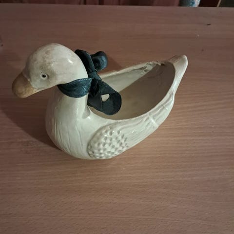 The larger figure measures approx. 14 cm in length and about 7–8 cm in height. The small one is approx. 2–3 cm tall and around 8–9 cm long. Both are crafted in white-glazed porcelain and feature open bases typical of older decorative pieces. They are in good condition with minor signs of use and some patina on the underside.