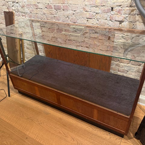 Smuk vintage butiksdisk / købmandsdisk med glasfront og fine udtrækshylder i eg.