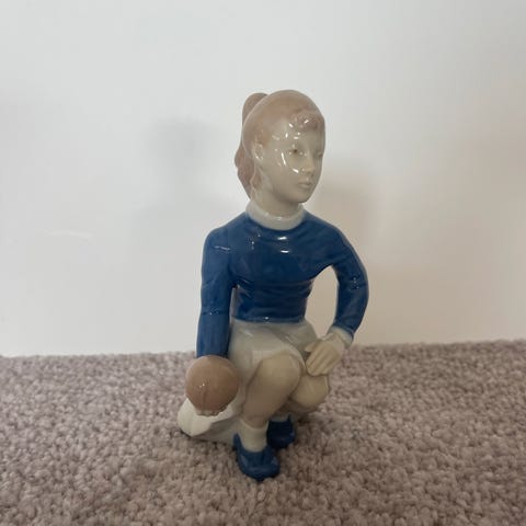 Keramikfigur fra ca. 1970–1985, forestillende en fodboldspiller i bevægelse. Figuren er udført i glaseret porcelæn/fin keramik i blå og hvide nuancer og måler ca. 17–18 cm i højden. Den fremstår i pæn stand med almindelige lette brugsspor og uden synlige skader.