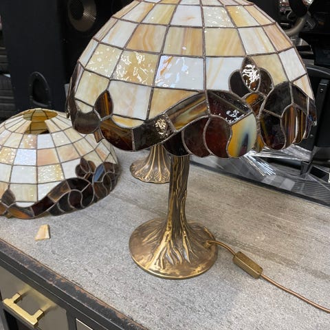 Evt. gratis levering. Håndlavet unika lampe med store stykker ægte rav lagt ind i Tiffany lignende lampe. Super fin stand med har en mindre revne i det ene glas, se billedet af dét. Jeg ved ikke om det er dansk rav, men mine forældre var rav samlere og den har stået hos dem.