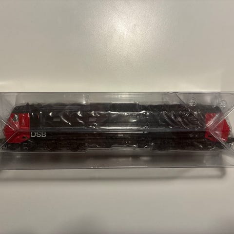 DSB modeltog sæt indeholdende flere lokomotiver og passagervogne i rød og sort farve. Sættet inkluderer skinner og elektrisk tilbehør til modeltogbanen. Passer til samlere og modeltogsentusiaster.