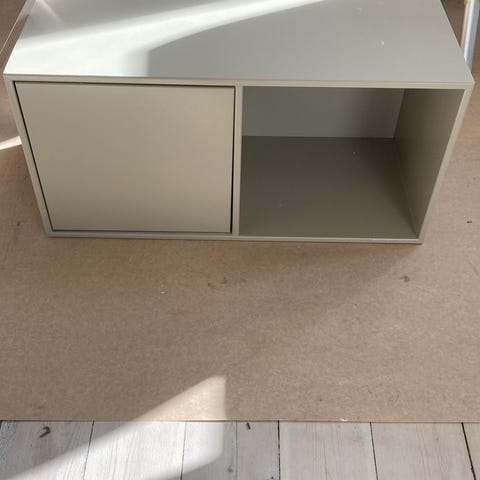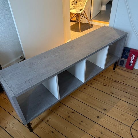 Står stabilt og uden skader – kun almindelige brugsspor (som kan ses på billedet). Der er bordet hul i bagvæggen så ledninger nemt kan føres derigennem hvis det bruges som TV- eller spilmøbel. Mærket omkring hullet er ikke ridser men affarvning, som kan males over.