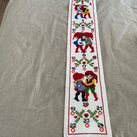 julekalender stof, broderet julekalender, retro julepynt, vintage jul, gammeldags jul, adventskalender, nissekalender, broderi, håndarbejde, håndlavet, nisser, tomte, skandinavisk jul, nordisk jul, juledekoration, julepynt til væg, juletradition, julehygge, oldschool jul, julegaveidé, dansk design jul, tekstil julekalender, julebroderi, julenisse, juletræ, snemand, juleklassiker, julehus, juleopslag, ophæng, vægophæng, juleinteriør, juleudsmykning, decemberkalender, 1–24 kalender, advent, julestemning.