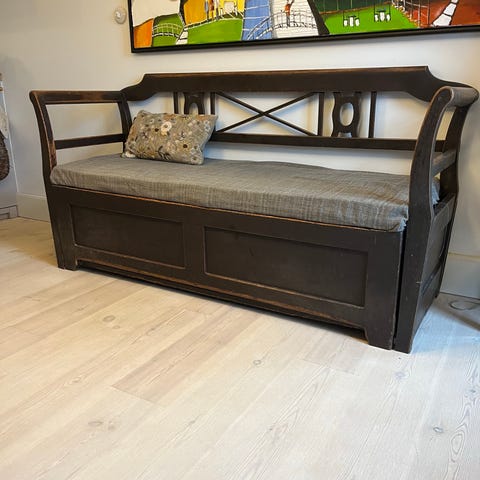 Møblet fremstår med autentisk patina og tydelige aldersspor, herunder mindre afskalninger i malingen, slid på sædekanten samt enkelte gamle ormestik i træet, som er almindelige for ældre allmogemøbler og udelukkende af kosmetisk karakter. Konstruktionen er solid og stabil, og træets naturlige aldring giver bænken et varmt og oprigtigt udtryk. Et møbel med ægthed, historie og sjæl, der passer perfekt ind i både landlige, rustikke og moderne hjem, hvor man ønsker et stykke svensk møbelhåndværk med karakter.