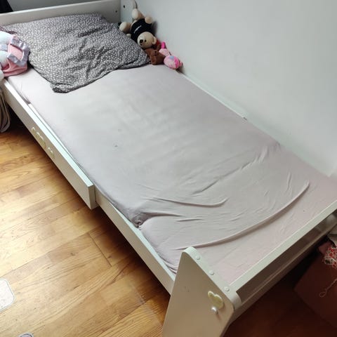 Hvid barneseng med tremmer og skumgummimadras,Afhentes i:,Røde Kors Ølby/Køge (259),Bemærk at mail, chat og beskeder ikke besvares, og varen skal købes på knappen "Gå til varen"