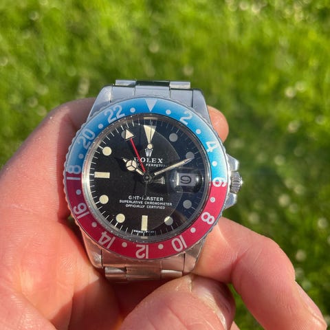 En karakterfuld to-tone GMT-Master med den eftertragtede nipple dial, kendetegnet ved de hævede guldfarvede timemarkeringer.