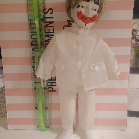 Dukke abe med rødt tøj og blåt mønstret skjorte