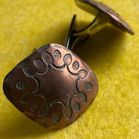 Jørgen Jensen står bag disse fine manchetknapper i meget gedigen kvalitet. Er en del af en serie smykker fra 50-erne. 25 x 15 x 13 mm. Stemplet på bagsiden PEWTER JØRGEN JENSEN 4 DENMARK HANDMADE. Meget velholdte, kun få meget små overfladeridser på bagsiden. ( sender gerne brev DAO + 23 kr )