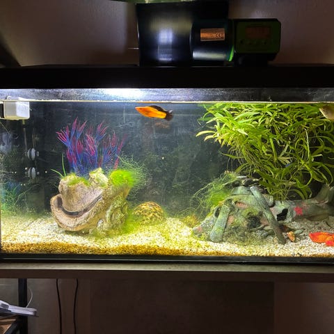Halvandet år gammelt. Alt udstyr medfølger. Vi rengør akvariet men venter hvis fisk( neon og gubbier og rejer) ønskes med. Det eneste man selv skal anskaffe er planter.