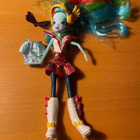 My Little Pony dukke med forskelligt tilbehør, herunder sko, vinger og kam. Dukken har pink tøj og langt hår, der kan styles. Passer til børn som legetøj.