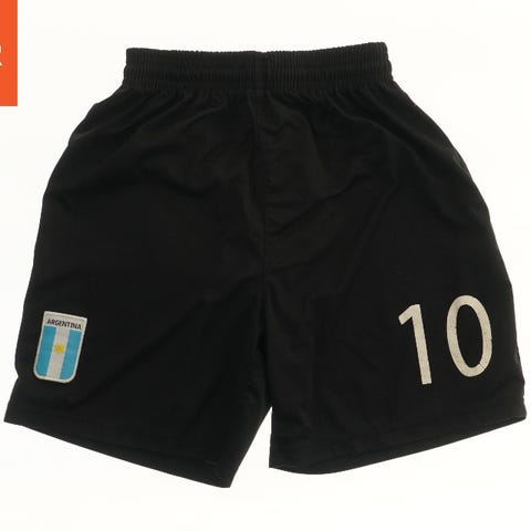 Røde fodboldshorts med elastik i taljen og hvide striber langs siderne. Foran står der 'Danmark' og nummeret '10'.