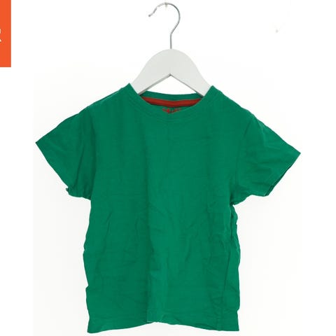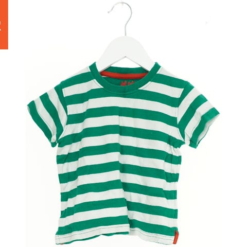 En kortærmet T-shirt med striber i blå, grøn, gul og hvid. På forsiden er der et stort, sort insektmotiv. T-shirten har rund halsudskæring.