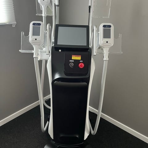 Cryo Plus multifunktionel skønhedsmaskine med funktioner til cryo, cavitation, body RF og lipo laser. Maskinen har en digital touchskærm til betjening og kontrol af forskellige behandlingsindstillinger.