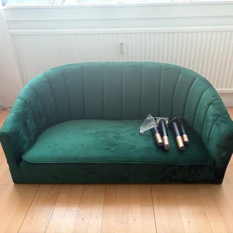 Smuk støvet grøn velour Sofa med matchende tilhørende pude og tæppe,