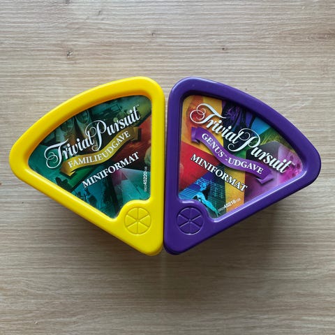 Trivial Pursuit Genus-udgave Miniformul brætspil med trekantet æske, indeholder spillekort og terning. Spillet er designet til trivia og quizspil.