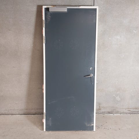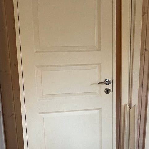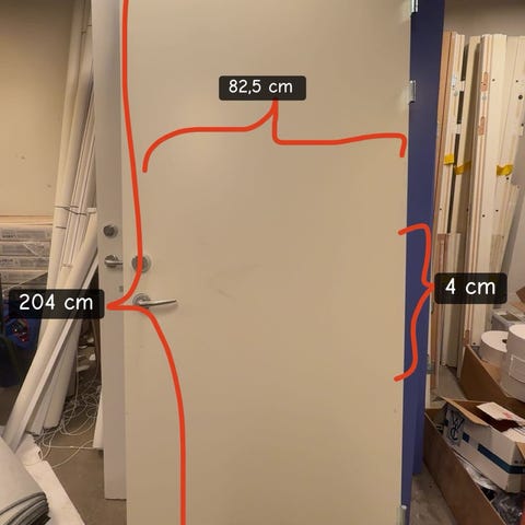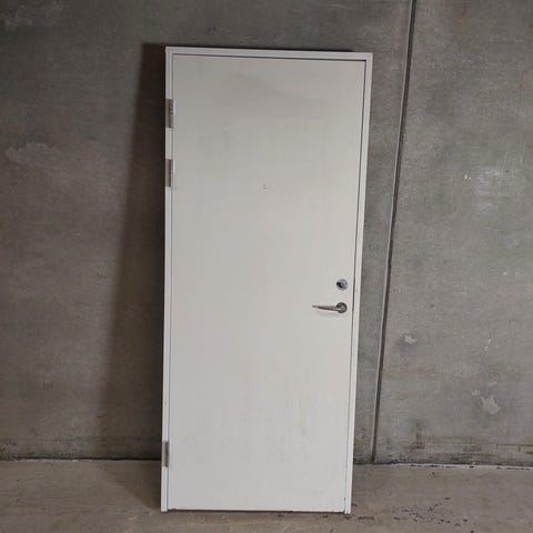 Indvendig dør 88,5x208cm i 121mm karm. Højre hængslet. Der er monteret toiletbesætning. Produceret af SWEDOOR. Bemærk at bundstykke ikke medfølger. Har slid nederst på dørblad, stifthuller fra gerigter og brugsspor. Dimension B:88,5 X H:208 X D:12,1cm