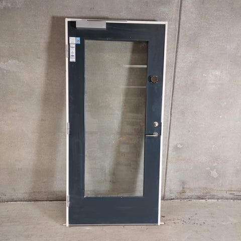 Indvendig dør 87,5x208cm med dørpumpe i 121mm karm. Venstre hængslet. Produceret af Trehøje Døre. Bemærk at bundstykke ikke medfølger. Der er stifthuller i karmen fra gerigter og brugsspor. Dimension B:87,5 X H:208 X D:12,1cm