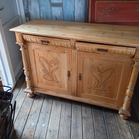 Kommode i fyrretræ med 4 skuffer fra trævarernes. Velholdt og smart udgave.