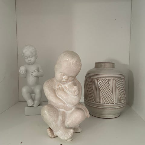 Sæt med to hvide porcelænsfigurer af børn. Figurerne er ca. 20 cm (den høje) og ca. 14 cm (den lille), begge i glansfuld hvid porcelæn. Fremstår i pæn vintage stand med normale aldersrelaterede brugsspor.