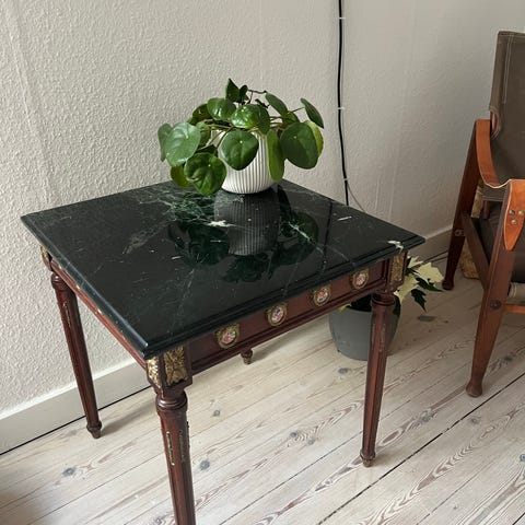 Det mørke mahogni og den grønne marmor skaber en flot kontrast, som giver bordet tyngde, elegance og klassisk karakter.