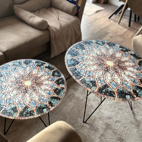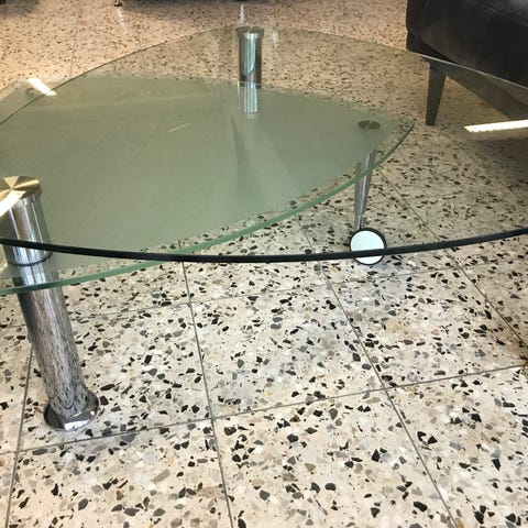 Et stort sofabord med glasplade som er magen til. Intet billede endnu. Bordpladen er lettere ridset.