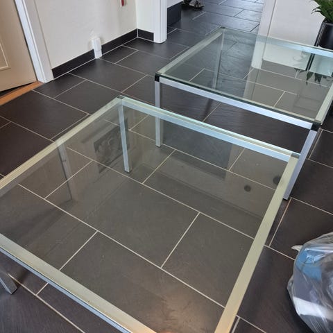 3 stk. små glasborde. Mål 50 * 50 cm. 1 stk. stort glasbord. Mål 80 * 140 cm.
