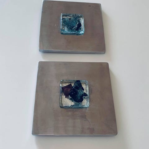 Set of two decorative wall tiles in a rustic, artistic style. Each piece measures approx. 16 × 16 cm and features layered elements including a ceramic/stone-like center piece, metal wire, and beads in warm copper and purple tones. The design has a unique handcrafted look with a textured, slightly shimmering center.