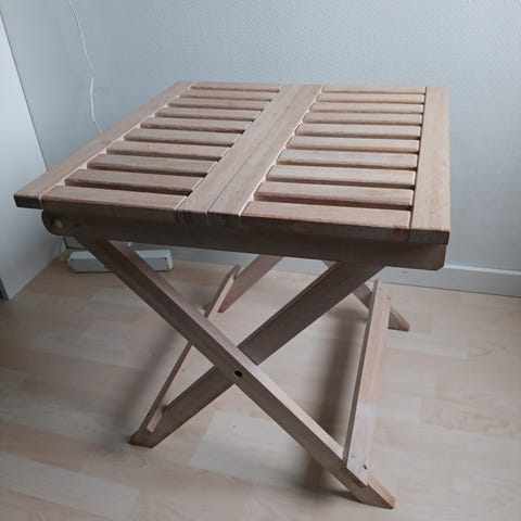 Ristklapbord, kvadratisk, sammenklappeligt sidebord i træ, praktisk og pladsbesparende.