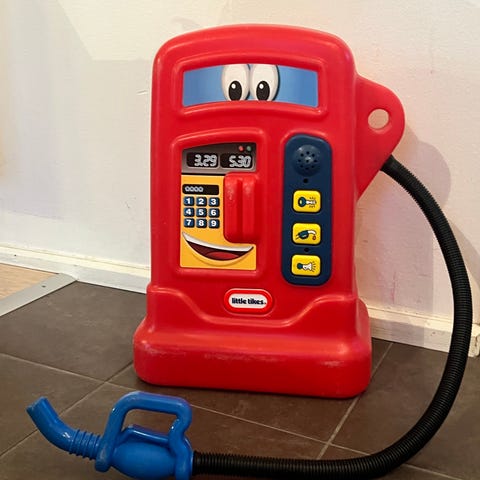 Benzin station med åben vaskehal. Malet træ i farvestrålende farver. Fuldt funktionsduelig med ganske små skrammer.