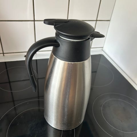 Stelton EM77 termokande i sort farve. Kanden er lavet af rustfrit stål med en sort plastbelægning. Den har en kapacitet på cirka 1 liter og er designet til at holde drikkevarer varme eller kolde i længere tid. Velegnet til brug i hjemmet eller på kontoret.
