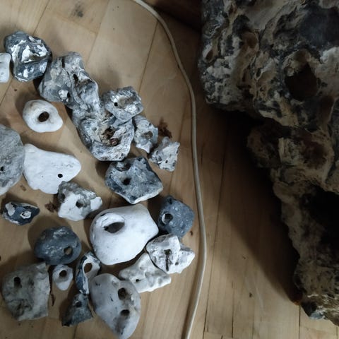 Dekorative stenfigurer med marihøne og velkommen tekst