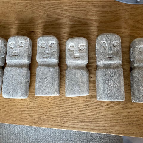 Dekorative stenfigurer sammensat af små sten med malede øjne, placeret på en stenbase med teksten 'VELKOMMEN'. Inkluderer en rød og sort malet marihøne som dekoration. Velegnet til pynt i hjemmet eller haven.
