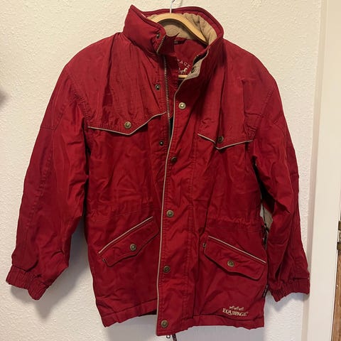 Lang brun Equipage vinterjakke til kvinder med hætte. Str. S. Jakken har lynlås og knaplukning, samt lommer med knapper. Materialet er syntetisk og jakken er designet til at give varme og beskyttelse mod vind og vejr.