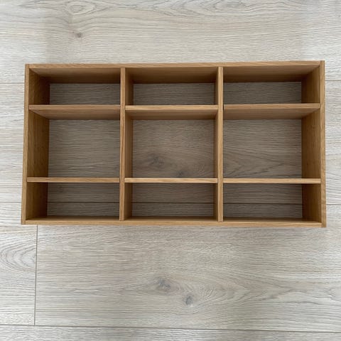 Håndlavede kopkasser/reoler i massivt ubehandlet egetræ med mørk bagvæg. Ydre mål er 34,5x34,5. De fire rum i hver reol er 15x15 cm. Uden brugsspor og ridser - i meget fin stand. Prisen er for begge reoler uden kopper. Kan leveres i Svendborg eller Næstved.
