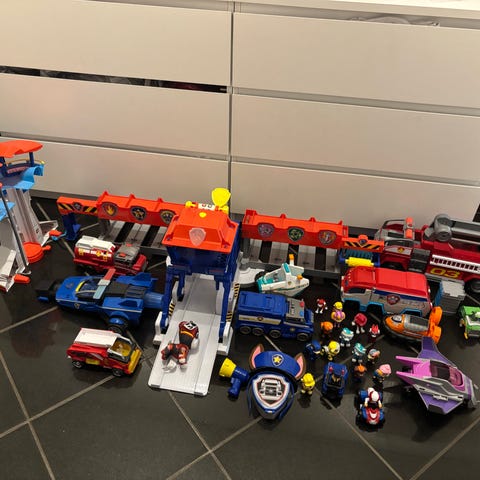 Paw Patrol legetøjssæt bestående af forskellige køretøjer og figurer. Sættet inkluderer brandbiler, politibiler, helikopter og diverse figurer fra Paw Patrol universet. Materialet er plastik og sættet er egnet til børn.