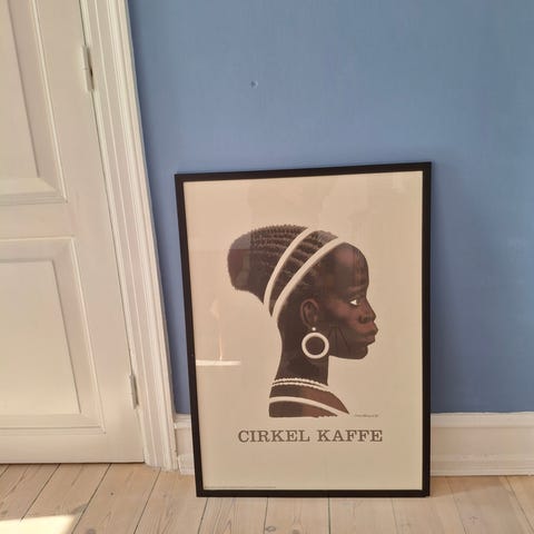 Gammel reproduktion af Sikker Hansens Cirkel Kaffe i sjælden stor størrelse (60x84 cm.) i professionel indramning (1.200kr. hos glarmester) med syrefrit papir under. Glasset mangler desværre, da billedet faldt ned, men rammen er 100% intakt.