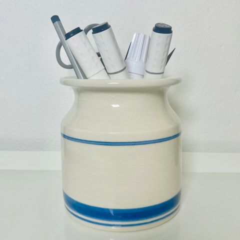 Fin keramik beholder med glasur og blå detaljer fra svenske Töreboda. Brug den fx til bestik, til blyanter eller som planteskjuler.