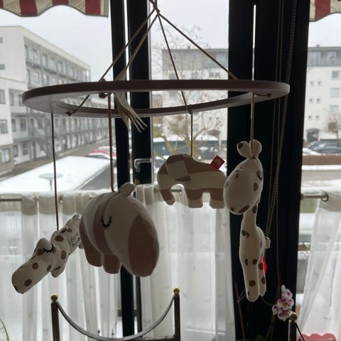 Done by Deer Dreamland Mobile er et børnelegetøj med hængende figurer som måne, stjerne, skyer og balloner. Mobilet er lavet af træ og har en neutral farvepalette med bløde pastelfarver. Det er designet til at hænge over en barneseng eller et legerum for at stimulere barnets visuelle sans.