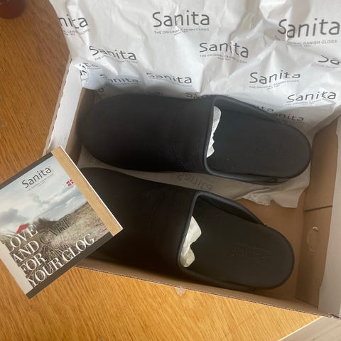 Sorte herre træsko i læder mærket Sanita , nypris 499 kr