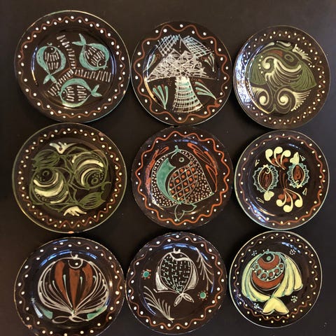 Flotte sildeskåle fra bl.a. Abbednæs Potteri og Knabstrup Teglværk og Keramik.