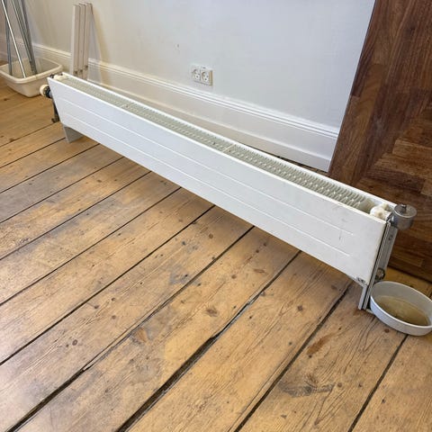 Hvid metal køleradiator med standard design til opvarmning af rum. Monteret med ventil og tilslutninger til vandbaseret varmesystem. Inkl thermostat. Målet er selve radiator.