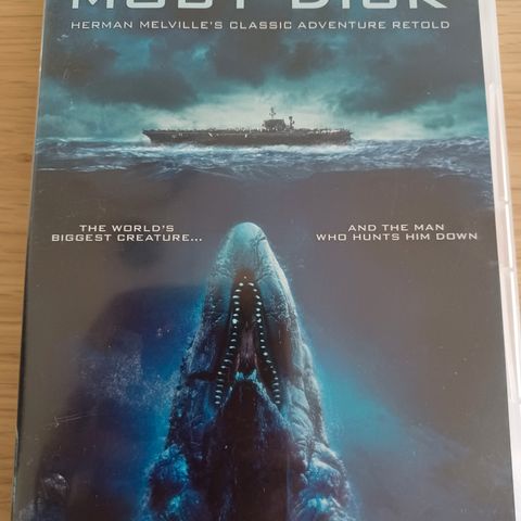 DVD med filmen Moby Dick, præsenteret af Francis Ford Coppola. Indeholder filmens forside med hovedpersoner og bagside med hvid hval og skib. Filmen er nomineret til fem Emmy Awards.