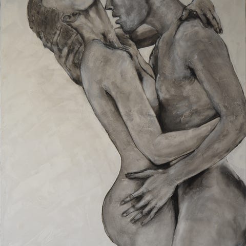A dynamic, intimate portrayal of two embracing figures, painted in expressive monochrome tones.