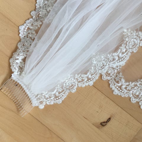 Slør med yndig blondekant. Sløret er nyt, 90-98 cm langt.
