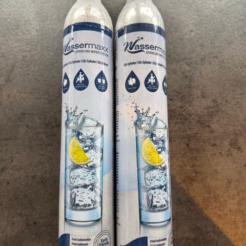 Minicooler CO2 engangsflaske med en kulsyre kapacitet på 1200 gram. Flasken er beregnet til engangsbrug og må ikke genpåfyldes. Den ene flaske er ny med ubrudt forsegling, den anden flaske er næsten ubrugt (omkring 90-95% kapacitet)