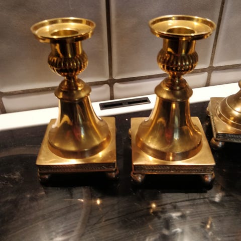 Scandia messing stager, fremstillet i Sverige omkring 1900. Riflet midterstykke, meget søjle agtig. Måler 20 cm høje og på en 4 -kantet fod på kugler 8x8 cm. Byd gerne
